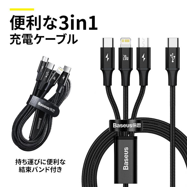 Baseus ライトニングケーブル Micro usb ケーブル Type c ケーブル 3in1 急速3.5A充電ケーブル と3in1 同時高速データ転送 対応 iOS - ライトニング iPhone と Android - Micro USB と Type-C 1.2m (ブラック)
